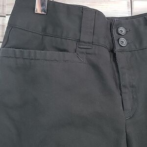 Classic Dockers in a cotton spandex blend cropped midrise pants with a wide waistband and double button closure, flat panel front with slit pockets, and a small slit hem. Good pre-owned condition. Normal signs of wash and wear.