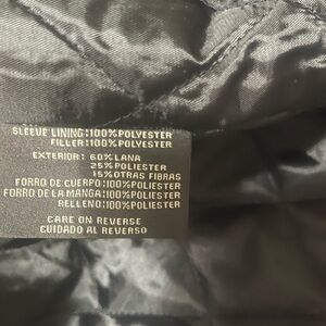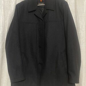 Classic dark black grey wool coat by Dockers. Features a button-up front and a sleek design. Perfect for formal or casual wear.