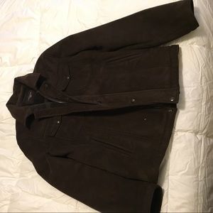 Nice condition. Missing zipper. All buttons are in good working condition. Dark grey fur inside. Brown soft fabric outside. Side pockets and front upper pockets