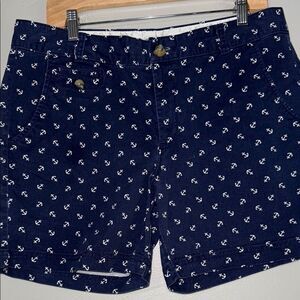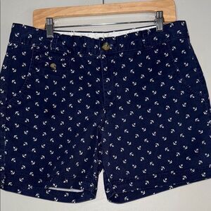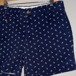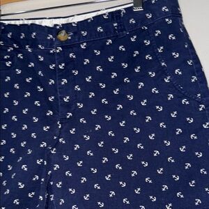 Nautical anchor, print shorts, navy, blue, and white, pockets in the back are not functional, pockets on the front are functional