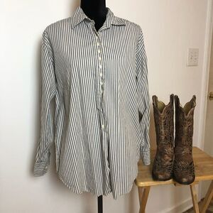 Dockers Blouse Button Down Blue Tan Striped Button Cuffs Collared Medium