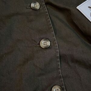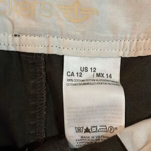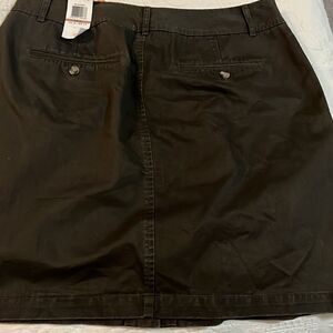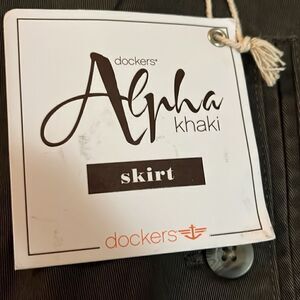 Dockers Alpha khaki skirt size 12 brand new with tags. The current color is Hunter green buttons down the front and has pockets on each side from waist to the bottom of the skirt is 20 inches.