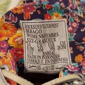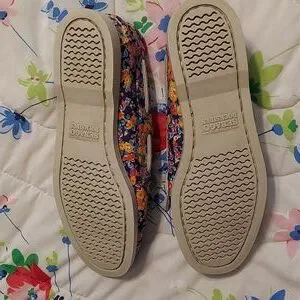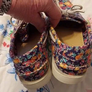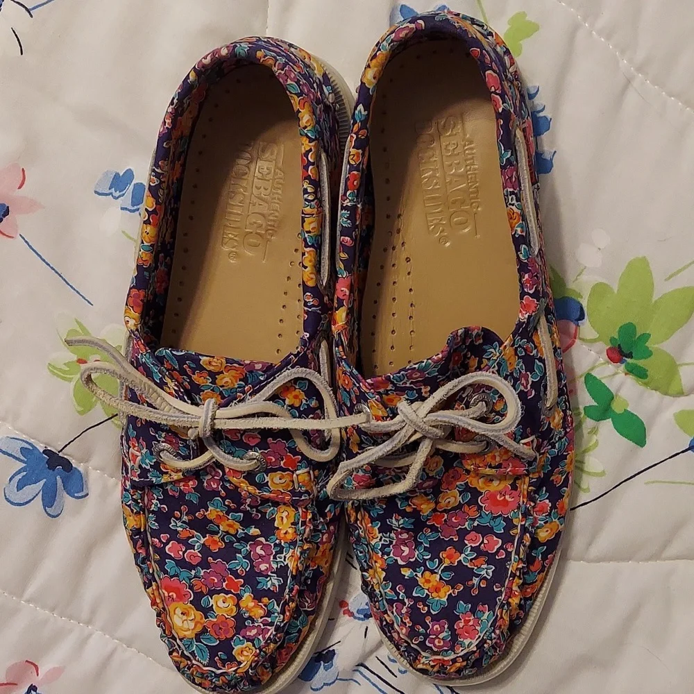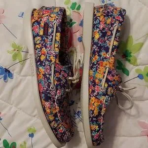 Sebago Tatum Docksides in a beautiful floral print, size 8.5M. A fun pattern with a purplish blue background with multicolored flowers. Worn very little, excellent condition. No rips, tears or spots. Memory foam insoles and flexible soles.