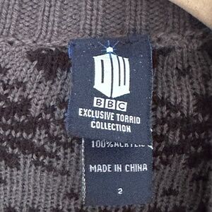 Plus Size 2 (2X) Doctor Who Cardigan. Black and grey/gray. Perfect for the time traveler in your life (or yourself). Subtle print, so suitable for any environment where you want to show your Whovian flare. Excellent condition. Open front - no buttons.