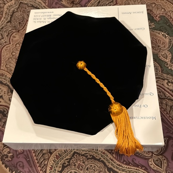 Eight sided tan black velvet hat with gold silk tassel. In like new condition from a smoke free home with no flaws.
