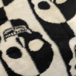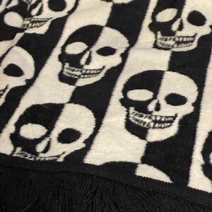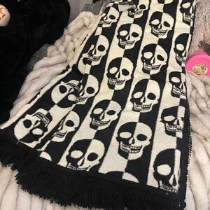 Made by Docofil. BNWT for Halloween 2023 black and white skulls skeleton print oversize throw blanket with black fringe knit at the bottom.