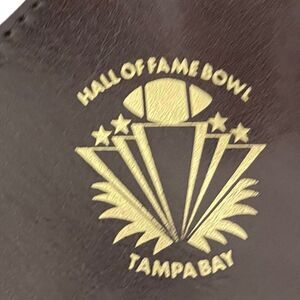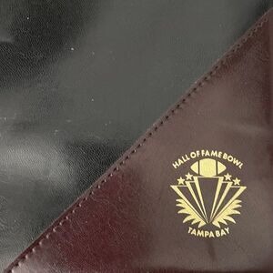 Faux leather document holder/portfolio. There is no brand. This piece does have the Hall of Fame Bowl Tampa Bay logo in the corner. Overall good condition with signs of wear.