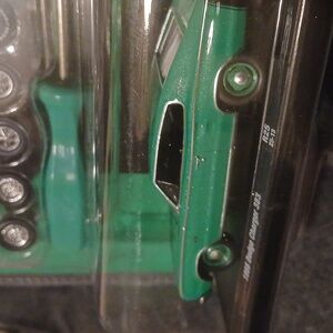 Dodge Charger model car in green. Includes extra wheels and a tool.