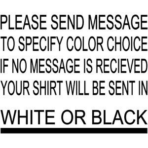 Please Send Message For Color Choice. ( If no color is specified, Your Shirt Will Be Sent In White or Black.)