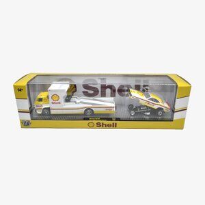 This collectible display from M2 Machines features two die-cast vehicles: a 1966 Dodge L600 COE truck and a 1971 Dodge Challenger Funny Car. Both models, part of M2 Machines' release S42, are 1:64 scale, with the truck measuring about 5.5" long, and the car 3" long. Both vehicles are white with yellow roofs and yellow details, and feature the Shell logo. The truck is available with either a silver-colored or gold-colored bed. This item was donated new in its original sealed box; the box shows some mild wear from storage. By purchasing this item, you're supporting Father Joe's Villages' mission to prevent and end homelessness in San Diego.