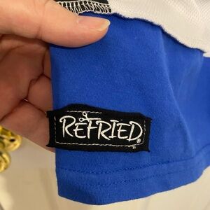 Show your team spirit with this stylish Dodgers women's jersey. Featuring a classic white and blue design, it's perfect for any fan. Comfortable and fashionable, this jersey is a must-have for game day. This is a one of a kind I ordered from Refried. It was too small for me so it’s never been worn. It’s made from mixed shirts. Sleeves are stretchy. Comfy material. Standout and show your Dodger spirit!