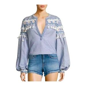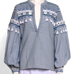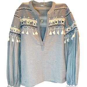 Chic light blue blouse with white embroidery. Features tassel accents and long sleeves. Ideal for casual wear. Tassels grommet long sleeve, V neck, excellent condition.