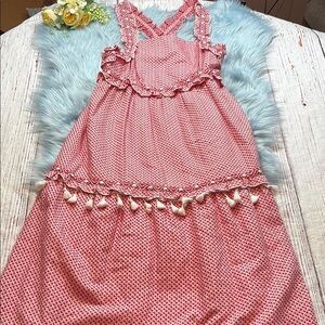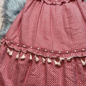Dodo Bar Or Red & White Printed Ruffle Joseff Maxi Dress. This dress is in good used condition