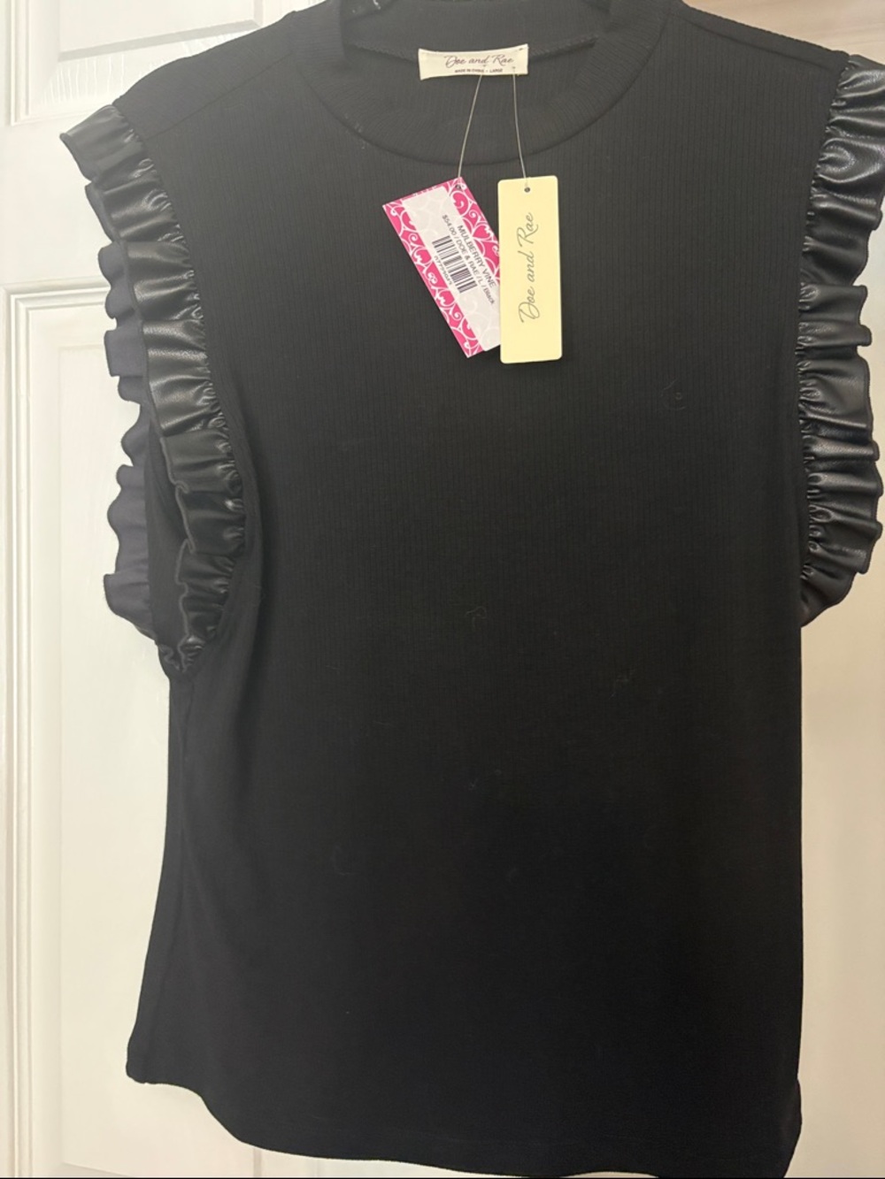 Doe & Rae Black Ribbed Tank with Satin Ruffle Sleeves