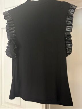Sleek black ribbed tank with glossy satin ruffle trim at the shoulders. Stretch knit body for a flattering fit. Polished look that layers easily for day or night.