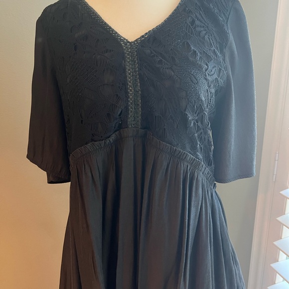 Chic black top with lace detailing. Perfect for versatile styling. Elegant and timeless design.