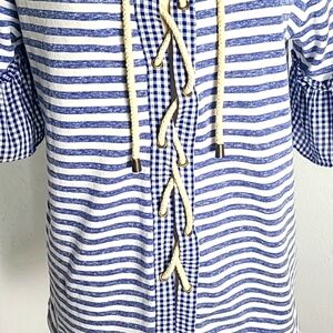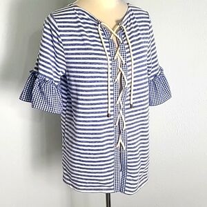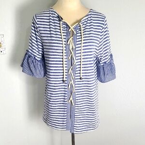 Doe & Rae Blue & White Stripe & Gingham Check Lace-up Top Size Medium