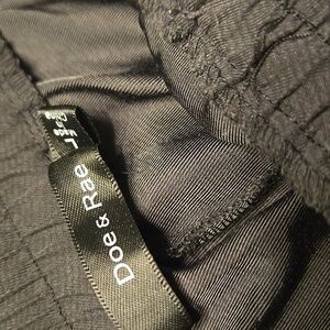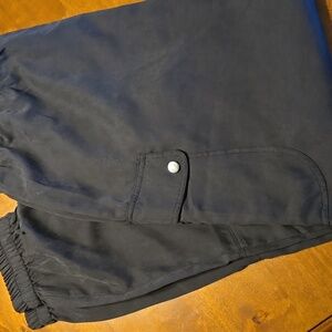 Comfortable charcoal cargo pants with elastic waistband. Features side pockets with button closure. Ideal for casual or dress wear with cute sandals or runners. 26" length, elastic waist, and bottoms. not certain I ever wore them. silky fabric.