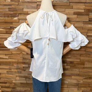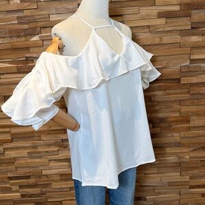 A feminine cold-shoulder blouse from Doe & Rae featuring soft, flowing ruffles along the sleeves and neckline. The halter-style V-neckline is accented with thin spaghetti straps and a subtle horizontal metal bar detail on the end, creating a stylish focal point. Voluminous, multi-layered ruffles frame the cold-shoulder cutouts for a romantic look. Made from lightweight fabric, this easy-to-wear top is a casual, fashion-forward piece from Doe & Rae, a brand known for trendy everyday styles.