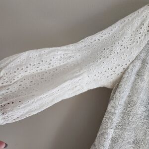Dress is designed by doe and ray and is fully lined. Sleeves are pique, with a poof at the bottom, and the back has a v, neck design with a tie. A beautiful addition to your spring collection