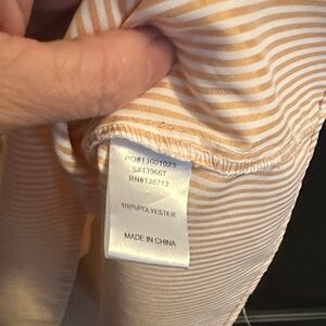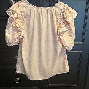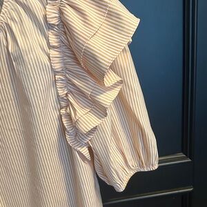 Chic cream blouse with ruffled sleeves. Features a tie neckline and subtle stripes.