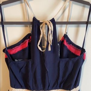 Women’s Doe and Rae blue, pink and tan color block maxi spaghetti strap dress that ties in the back. Beautiful detail just between the Chevy area with elastic waist band. Size is a S and in EUC.