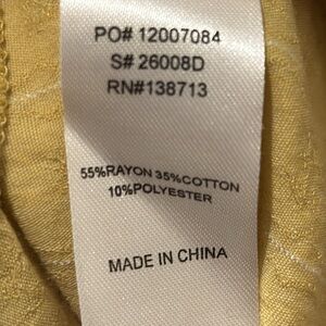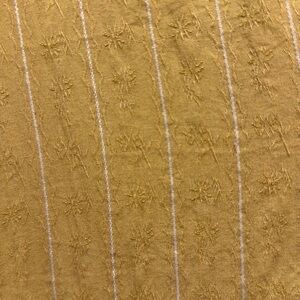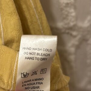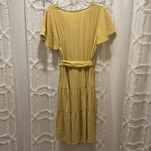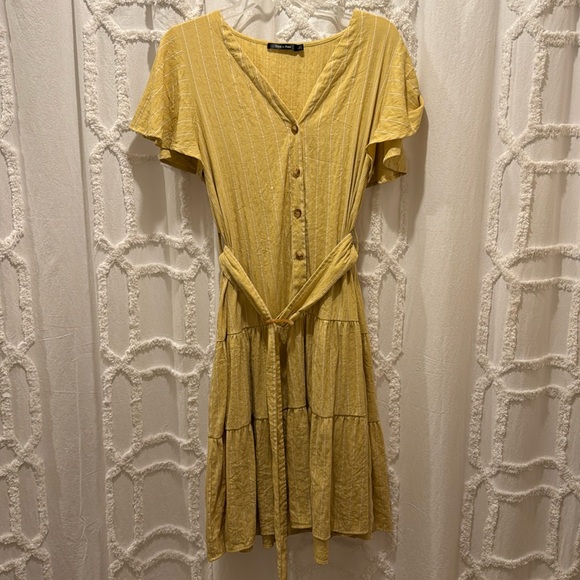 Mustard pinstripe dress from Doe & Rae. Five buttons and attached belt. Butterfly sleeves. Condition: Gently Worn. Excellent.