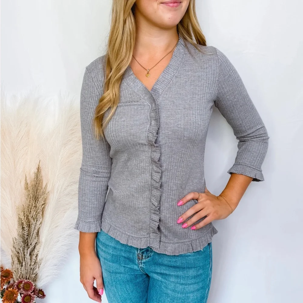 Stylish gray ribbed cardigan featuring a charming ruffle trim. Perfect for layering.