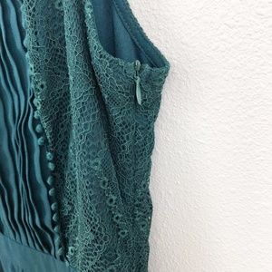 Doe & Rae Stitch Fix dark emerald green dress with lace panels and pleating. Sleeveless. EUC. Side zip. 100% polyester. Hand Wash cold; hang to dry.