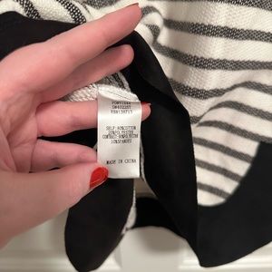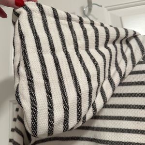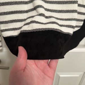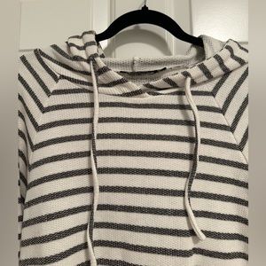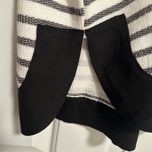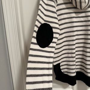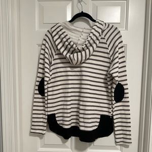 Doe & Rae Stripe Hoodie with contrast elbow patches and bottom hem. Lightweight textured material with stripes and elevated with suede like material at the elbows and bottom hem. New without tags