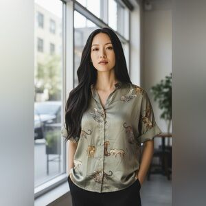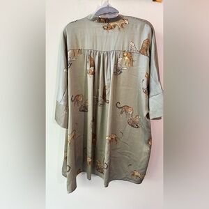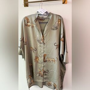 SEO Tags: Doe & Rae tunic top leopard print button front oversized blouse sage green rayon polyester spandex small 0318