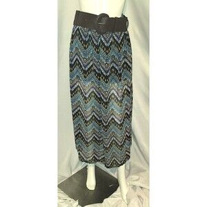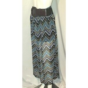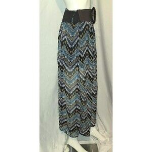 Multicolor, casual maxi skirt. It is sheer but has 1/4 lining. Wonderful geometric pattern. The 3" wide belt comes with the skirt, it is removeable for washing and the belt has stretch in the back as well as adjustment in the front.