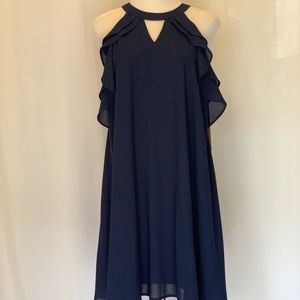 Navy blue crepe material lined in a stretch Polyester. A-line dress with ruffles at the armholes. 100% Polyester. Measurements laying flat: Armpit to Armpit 18.5”; Waist 22”; Hips 24”; Length 35”.