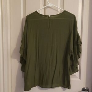 Chic olive blouse with ruffle sleeves. Ideal for versatile styling.