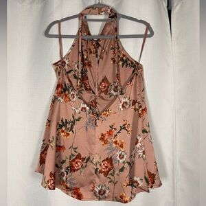 Brand New With Tags. Doe & Rae Pink Floral Satin Halter Top. Sleeveless halter-style floral top with a dusty rose background and a keyhole front detail. The fabric features a vibrant floral print in shades of rust, white, cream, and green. The back has a button closure at the neck and a slight draped cut. Lower in the back. Adjustable forgets straps down the back. The fit is flowy and flared, giving it a soft, feminine silhouette. Satin like fabric. Size Medium.