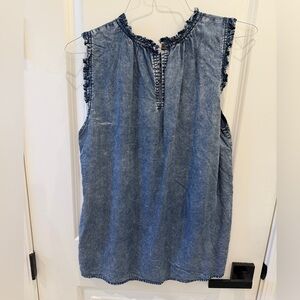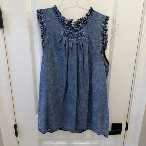 Chic denim top with ruffled edges. Sleeveless design. Ideal for casual wear.