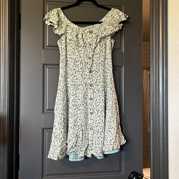 Boutique style sun dress. Can be worn off the shoulder. Top is elastic/ stretchy. Worn 3 times. No alterations. It is lined with a green under fabric