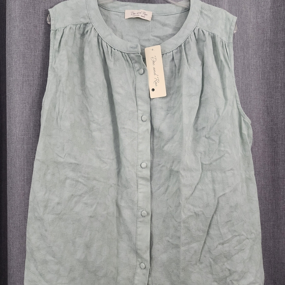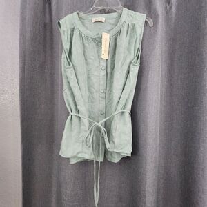 Chic sleeveless blouse with button-down front. Soft fabric in a sage hue. Ideal for versatile styling.