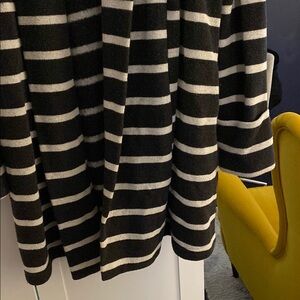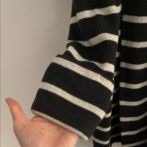 Elevate your style with this chic striped black and white coat. Perfect for any occasion, this coat offers both comfort and elegance.