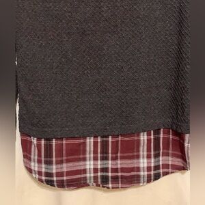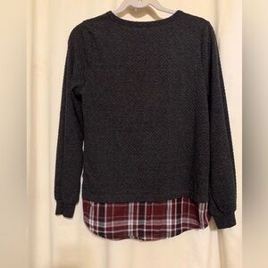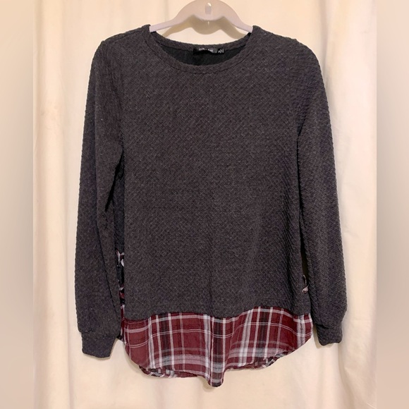 Pullover shirt by Doe & Rae. Rounded neckline with a thermal texture and plaid insert at bottom and plaid braid on the sides with silver rivets. Very cute. In GC. Color is Grey. Size is Small.