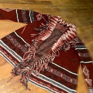 The Doe & Rae Soft & Really Warm Rust Sweater is a stylish and comfortable choice for the winter season. Made from a blend of acrylic polyester and spandex, this sweater offers a stretchy and open fit, perfect for layering over your favorite outfit. The Aztec pattern and ruffle accents add a trendy touch, while the rich brown color adds warmth to your look. With its long sleeves and cardigan style, this sweater is both fashionable and practical for staying cozy during the cold weather.