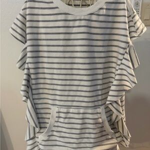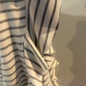 Doe & Rae striped ruffle-sleeve sweatshirt * Horizontal Striping: Typically in a gray/white or navy/white color scheme. * Ruffle Detailing: Distinctive tiered ruffles that run along the sleeves or sides of the garment. * Kangaroo Pocket: A large front pouch pocket, similar to a traditional hoodie. Smoke free, dog friendly home