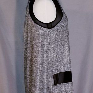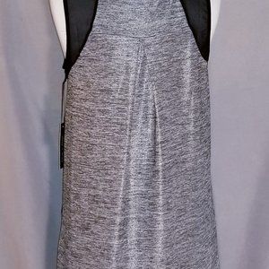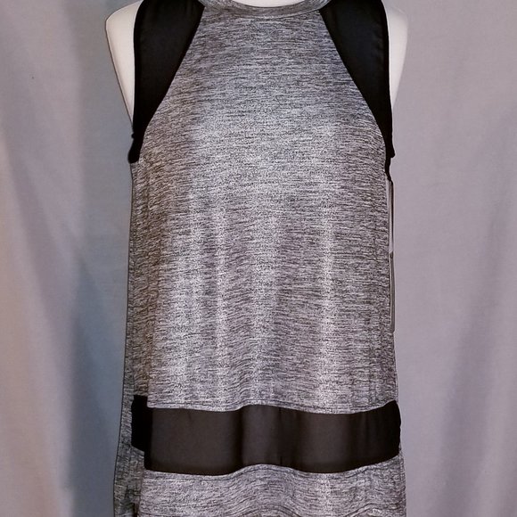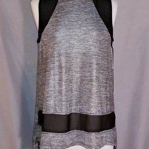 New with tags. Size small. Doe & Rae boutique brand top. Grey body with a metallic shimmer in the material. Black band above the waist and around the arms is sheer. High low cut. Slight pleat in the back. Great for layering or just by itself.