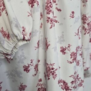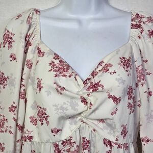 Doe & Rae blouse in white with delicate mauve floral print. Features sweetheart neckline with front twist, flowy silhouette, and long puff sleeves with elastic cuffs. Fully lined, 100% polyester. Women’s size Large.