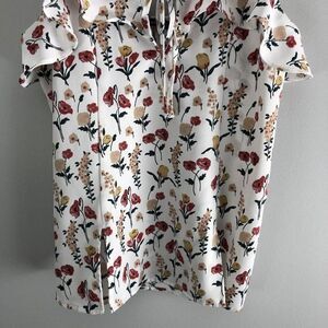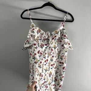 Doe & Rae White Floral Ruffle Trim Cami Tank Top Women's. No noticeable flaws or stains. There are a few pinprick marks, which I think are part of the fabric print. Please see photos for more information.