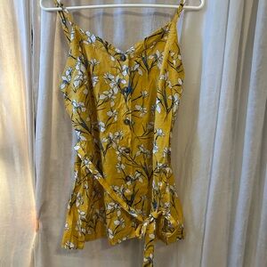 Bright yellow floral cami with button-front closure. Adjustable spaghetti straps. White and navy floral print. Flowy, lightweight silhouette ideal for warm weather.