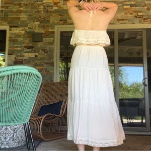 -creamy fabric, tiered skirt, lace trim, tassel ties around the neck