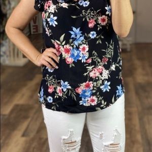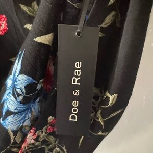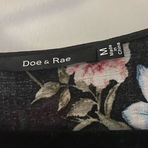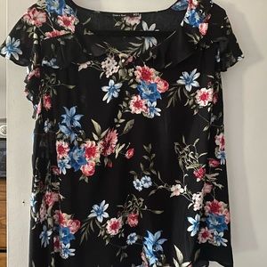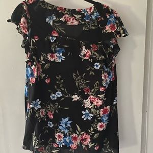 Doe & Rae ruffle blouse. Black background with a vibrant floral print. 100% Rayon