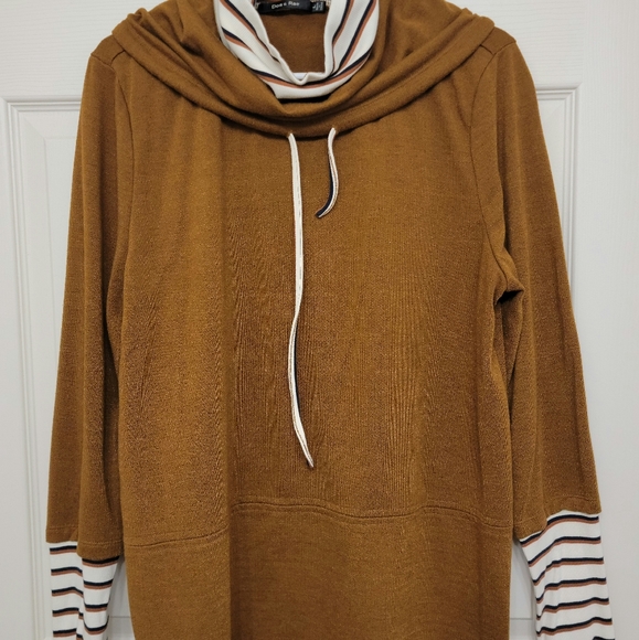 Burnt orange sweater with stripped fabric cowl neck and lower sleeve. Hooded with matching stripped drawstring.