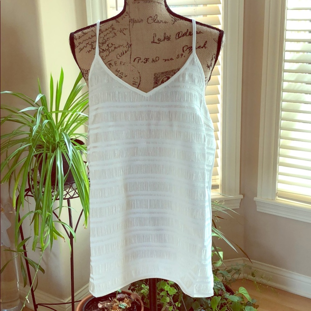 Off-white spaghetti strap tank top, vneck, stripe detailing on front, slight high-low hem, can be dressed up or down, slightly oversized, polyester